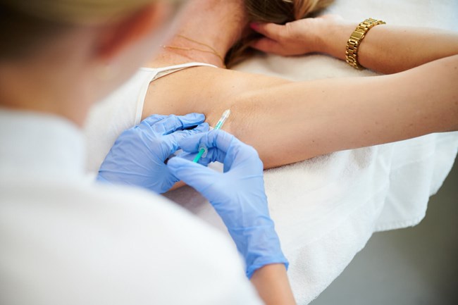 Een behandeling tegen overmatig zweten duurt ongeveer 30 minuten en vindt plaats bij een cosmetisch arts. Eerst desinfecteren we de huid van het te behandelen gebied en plaatsen hele oppervlakkige injecties in de huid waar de zweetklieren zich bevinden. De tijdelijke spierontspanner begint langzaam in te werken en na enkele dagen zal het effect te merken zijn. Hierna zal de zweetproductie sterk verminderd tot uitgeschakeld zijn. Sommige mensen zijn bang dat het lichaam na zo’n behandeling op andere plekken gaat compenseren en dus op andere plakken extra gaat zweten. Uit ervaring weten wij dat dit niet het geval is. Het effect van de behandeling houdt gemiddeld ongeveer zes maanden aan, wat langer is dan een normale behandeling met een tijdelijke spierontspanner. De reden dat het effect zo lang aanhoudt, is dat het op een andere manier geïnjecteerd wordt en de dosis vele malen hoger is dan de dosis die wij gebruiken voor bijvoorbeeld het behandelen van de frons.