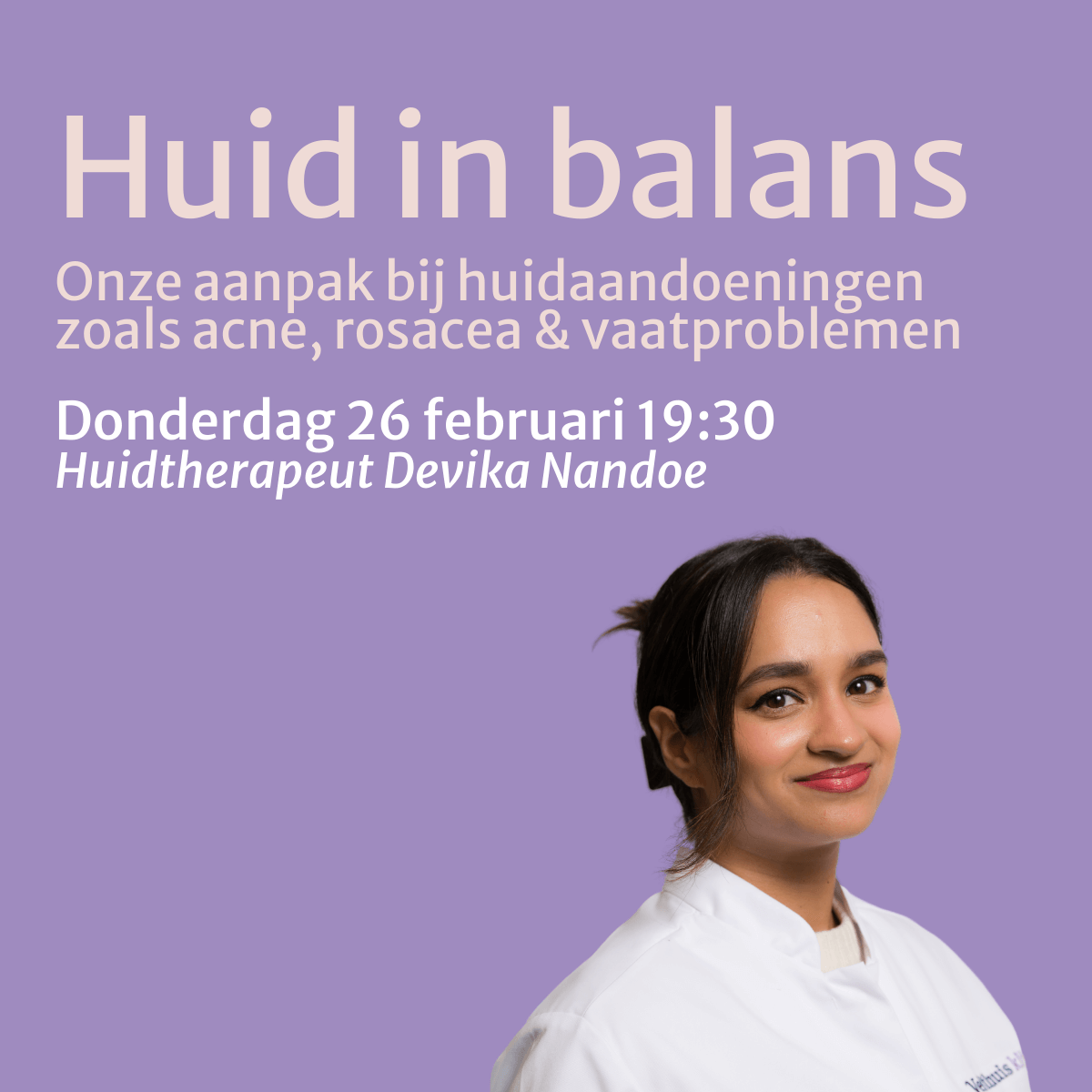 Tijdens dit webinar vertelt onze huidtherapeut Devika Nandoe je alles over onze aanpak bij huidaandoeningen zoals acne, rosacea en vaatproblemen. We staan stil bij hoe we je kunnen helpen om je huid weer in balans te krijgen en hoe het traject eruit ziet.